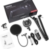 • What you get: a USB microphone, a boom arm stand, a metal shock mount, a pop filter, and a USB cable
